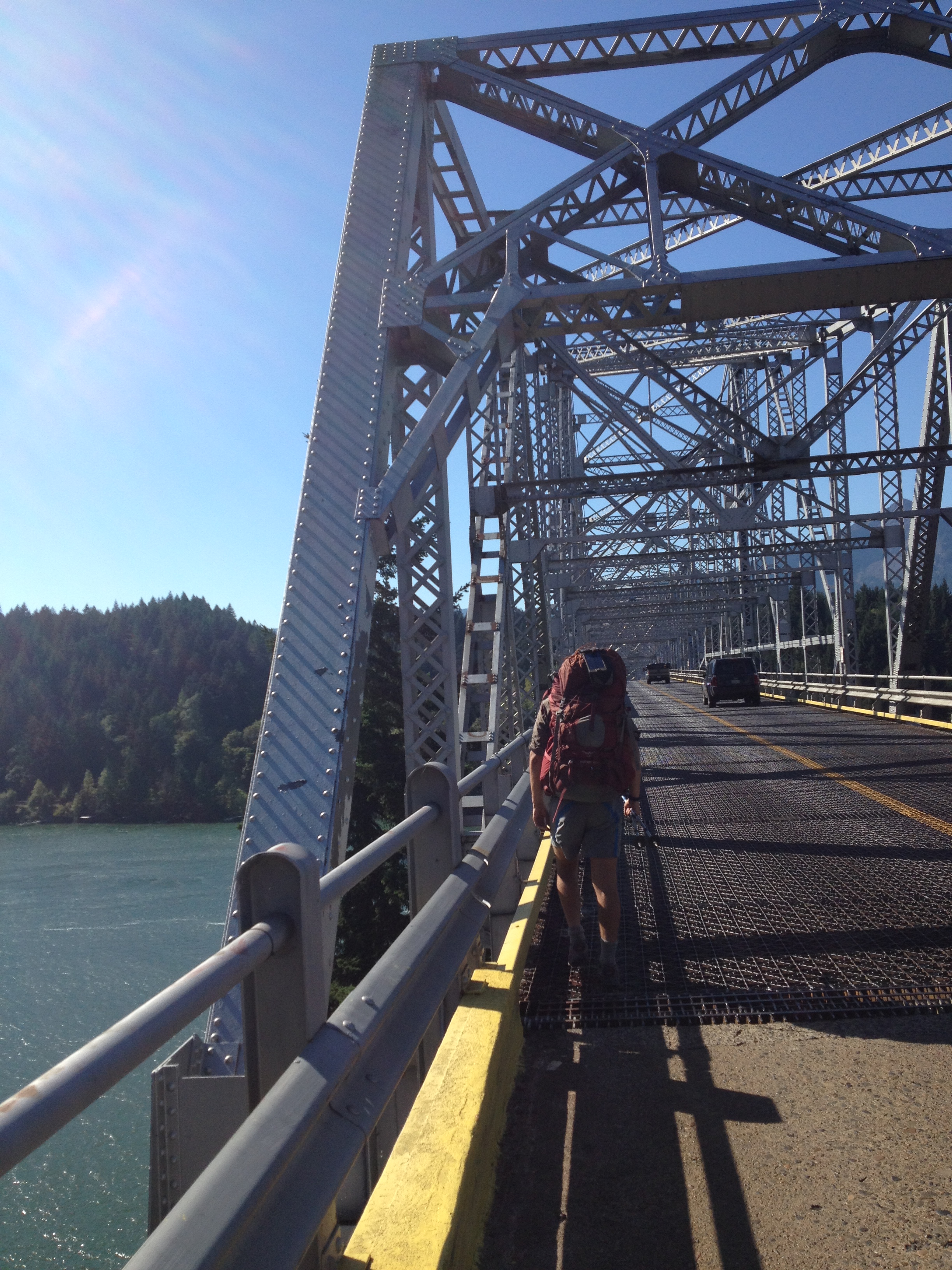 Walking across the Bridge of the Gods into Washington was a supernal experience. Despite the fact that there was no pedestrian walkway or shoulder over the two-lane bridge. Despite the fact that the bridge had a grated floor, where we could see 100 feet down to the river flowing below, seriously challenging my fear of heights. Despite the grumpy man at the toll booth, who had, maybe, seen one too many PCT hikers, telling us to ” walk on the left side, so you’ll see the car that hits you.” Despite these things, the feeling was sublime. Since our dad had kicked us out of the car at the Mexican border nearly four months before, we had traveled 2155 miles by good old step-by-step walking, and we were finally back in our home state. The home-land.